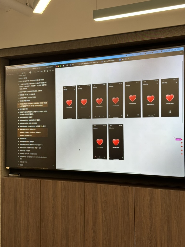 애플팀 리뷰가 있었던날! 전날에 완성하지 못했던 대본작업을 아침일찍 카페테리아에서 마무리했다. 그리고 세션 내내 발표 연습을 했다. 사실 이날 세션은 모든 팀이 서로 다른 시간에 애플 팀 리뷰가 있던 날이어서 자율적으로 시간을 보냈다. 그래서 우리팀은 앱 이름을 정하는 시간을 가졌다. 완전 브레인스토밍식으로 생각나는 이름을 말하고, 그중에서 반응이 좋은 것들을 표시했다. 그리고 타겟에게 그중에서 고르도록 했다. 그렇게해서 결정된 우리 앱의 이름은..! 바로... 뚜잉(DDooing)! 버튼을 누르는 귀여운 느낌과, 너 지금 뭐해?(doing)의 의미를 담았다. 귀여워서 맘에 든다..!