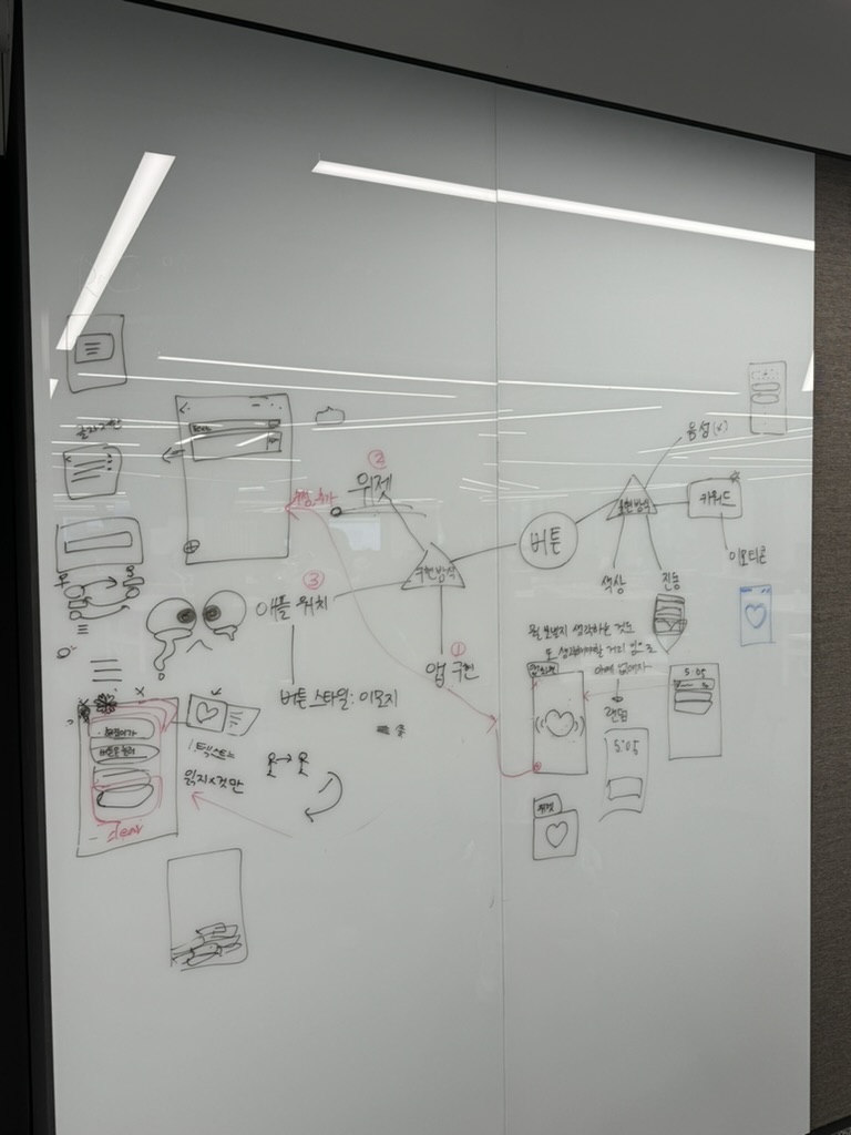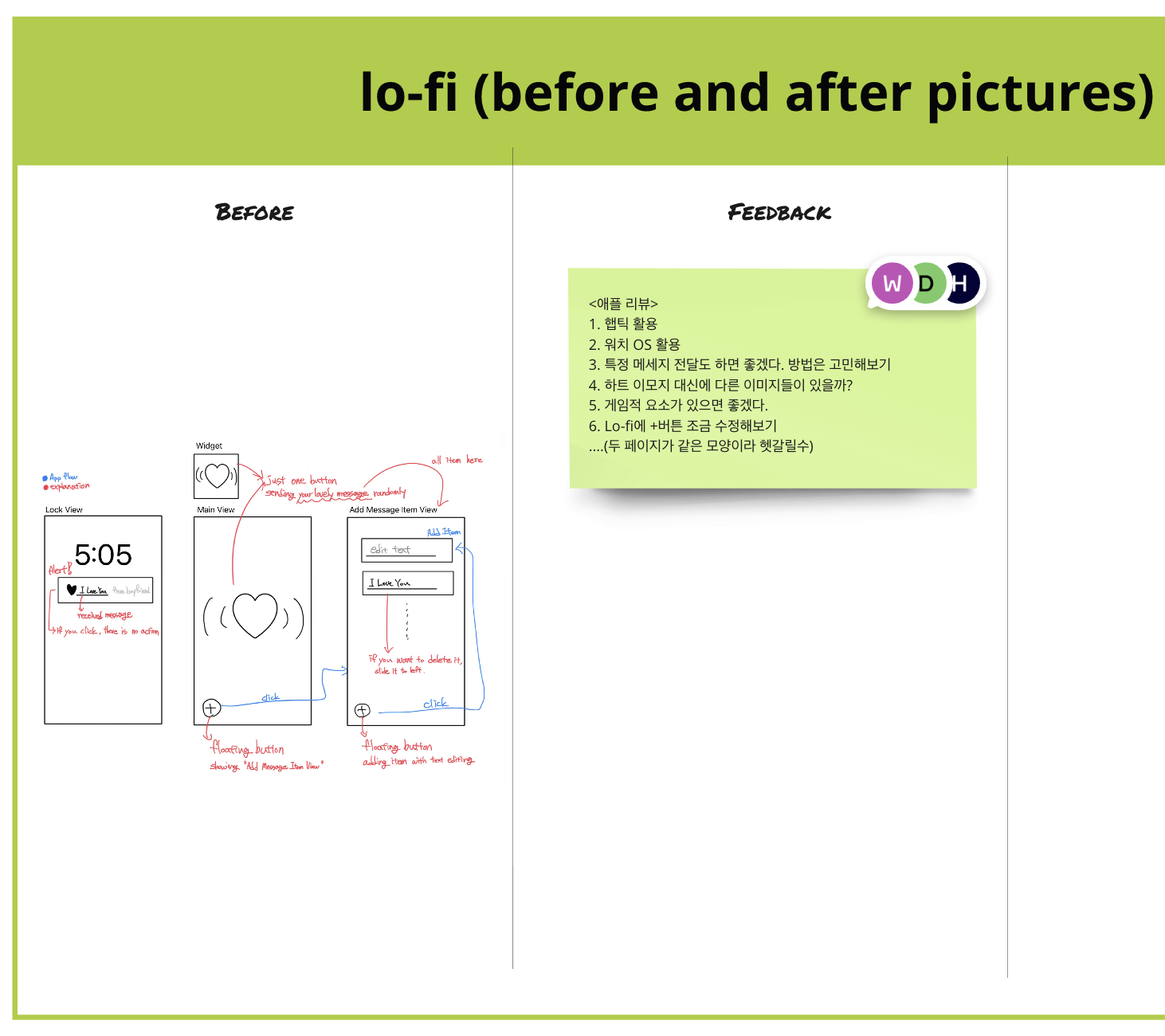 지난주에 정한 problem을 바탕으로 주말동안 solution concept을 각자 생각해오기로 했다. 나는 여자친구와 소통하는 방식을 생각해서 출근하거나 등교하는 시간에 자신의 모습을 찍어서 보내는 (locket을 레퍼런스로 하는) 컨셉과, 인정의 말을 사랑으로 느낀다는 점에서 손편지 작성을 유도하는 두 가지 컨셉을 생각해갔다. 그리고 세션시간에 각자의 컨셉에 대한 소개를 하고 비슷한 컨셉끼리 카테고라이징 한 이후 어떤 컨셉이 제일 좋을지 투표하는 시간을 가졌다. 그 결과 yo! 라는 어플을 레퍼런스삼은 단순한 버튼으로 메세지를 전하는 컨셉으로 의견을 수렴했다. 이 컨셉을 바탕으로 MVP와 앱 플로우에 대해 다양한 논의를 거치고 Lo-Fi까지 그려냈다.
