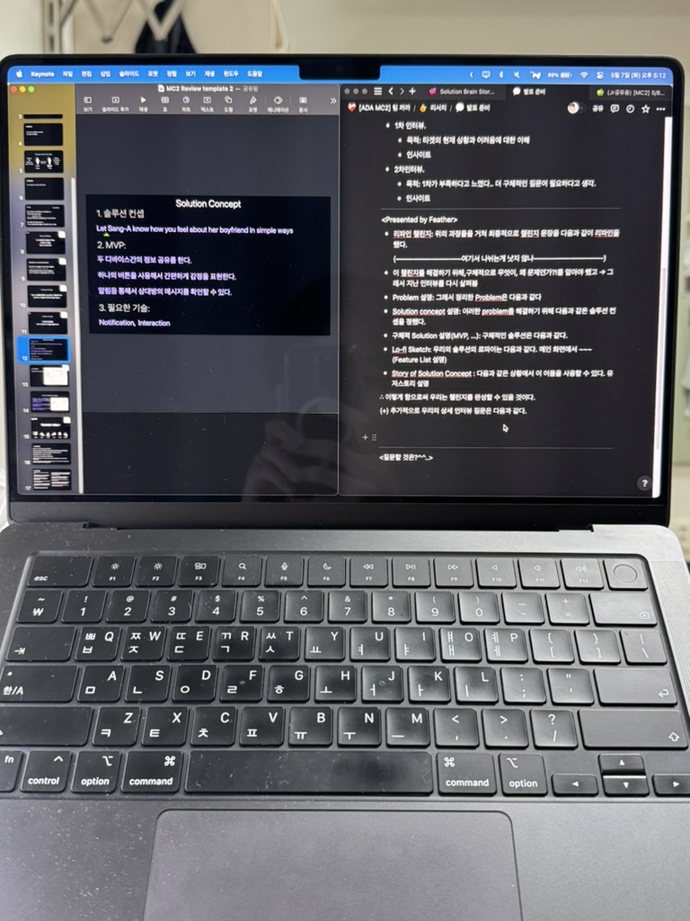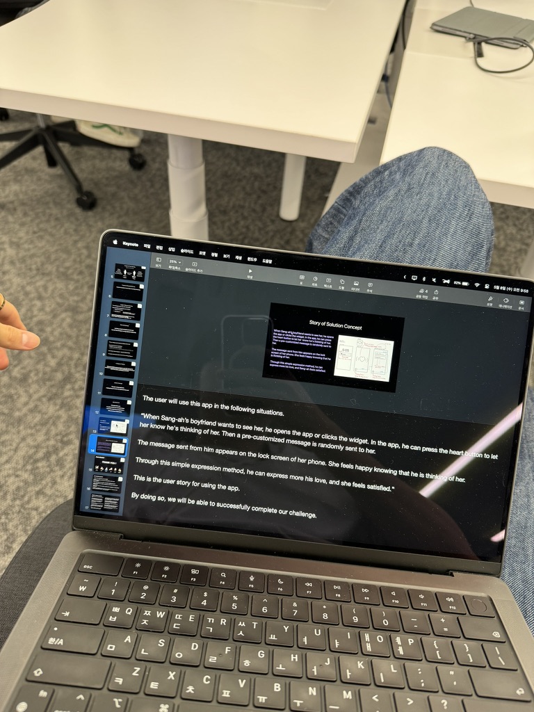 다음날은 Apple Team Meeting이 예정되어있었다. 애플의 글로벌 아카데미 멘토들에게 지금까지의 MC2과정을 소개하고, 피드백을 받는 시간이었다. 무려 영어로... 발표자는 2명이 하기로 했고, 내가 발표를 맡고 싶다고 말했다. 그리고 발표 키노트도 각자 파트를 나눠서 제작을 시작했다.