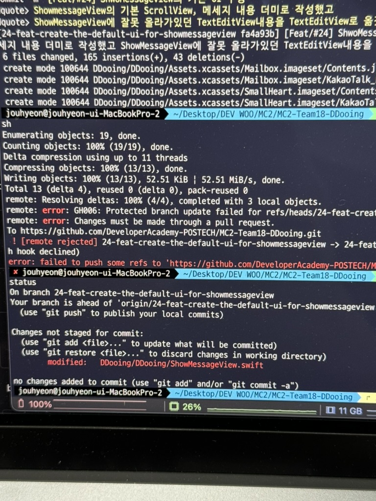 그렇게 잘되는 와중에 문제가 생겼다...! 어제 테스트로 작업할때 내가 맡은 View를 다른 View파일에서 작업을 하고있었고, 오늘 그걸 알아서 merge하는 과정에서 문제가 생겼다. conflict가 생긴것까지는 괜찮았는데 merge할 때 devleop이 아니라 main 브랜치에 올리는 문제가 발생했고 결국 밤 11시까지 도란 방에 모여 긴급대책회의를 진행했다 ㅋ ㅋㅋ ㅋㅋ 다행히 각자 로컬에 백업해놓은 코드가 있었고, 도란의 캐리로 브랜치문제는 잘 해결되었다.