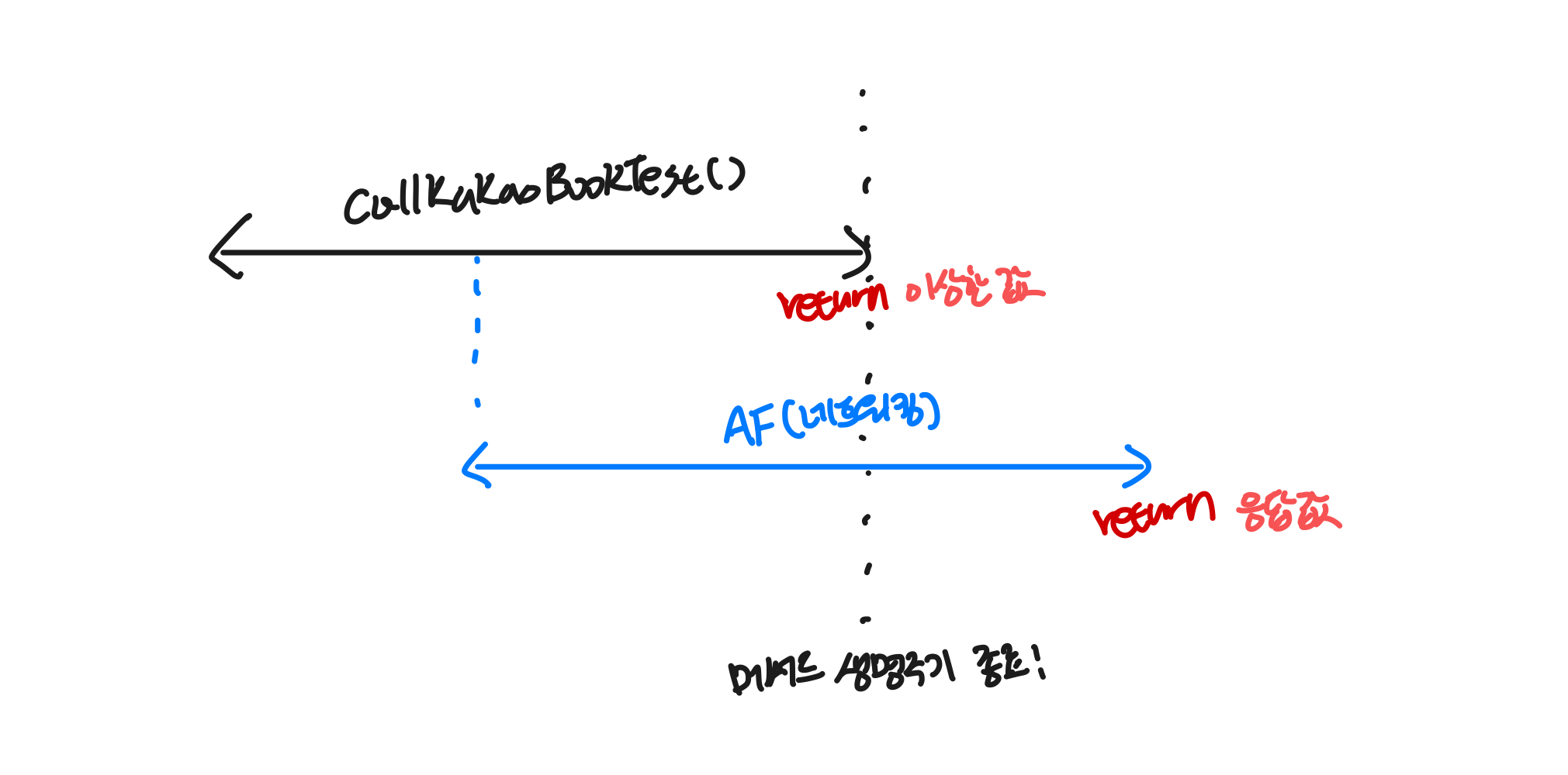그래서 AF구문은 `callKakaoBookTest()`메서드보다 늦게 끝나게 된다.