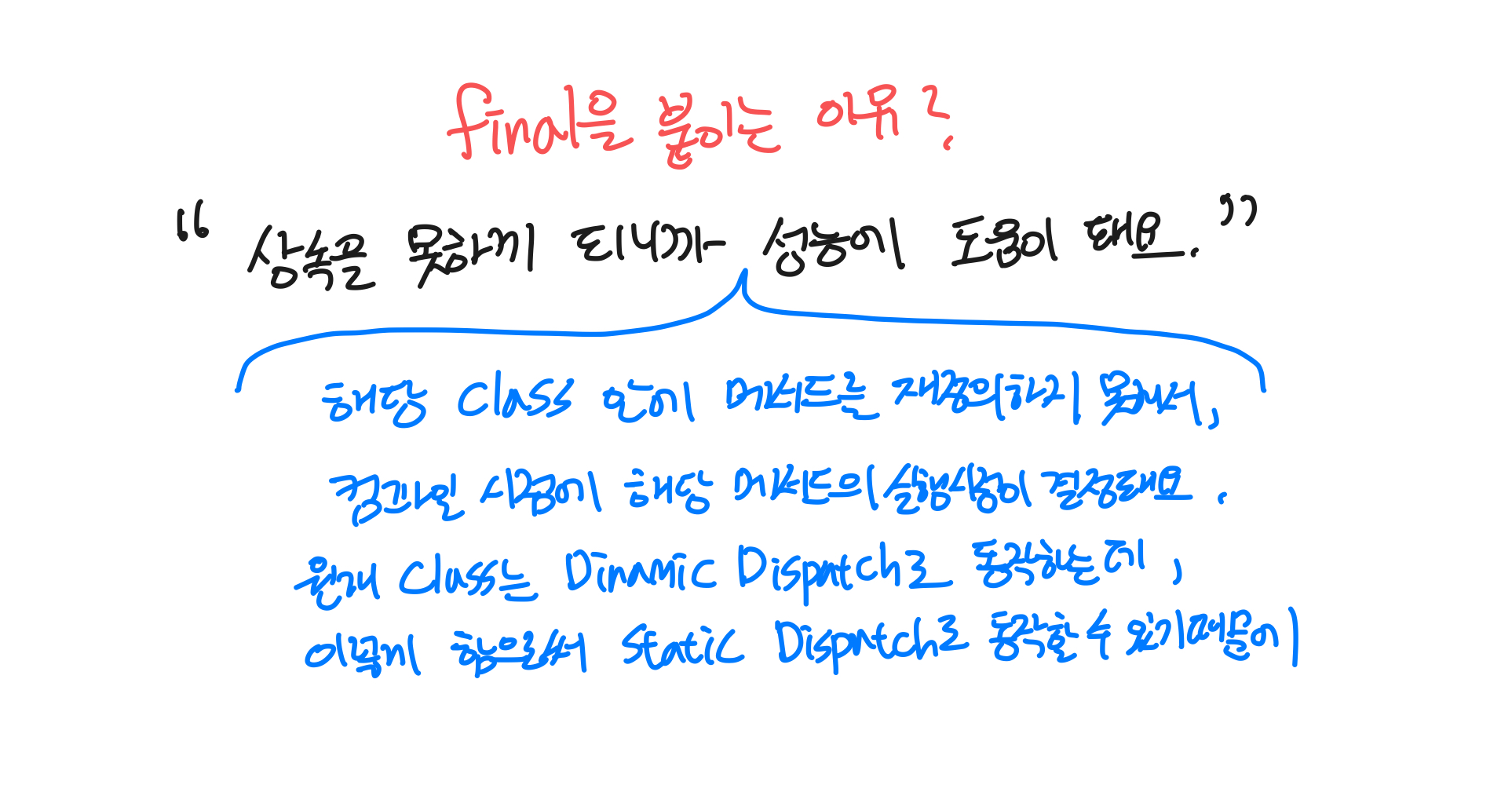 Method Dispatch 개념에서 힌트를 얻었듯이, 상속되지 않는 class에 final을 붙이게 되면, 이제 이 class 안의 메서드들의 실행시점이 확실히 결정되게 된다.