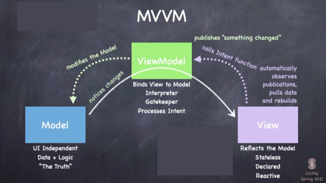 View는 Date Binding을 통해 ViewModel과 연결되고, ViewModel은 Model의 변경사항을 View에게 직접 알리지는 않고 무언가가 변경되 었다고 발표(Publish)한다는 특징이 있다.