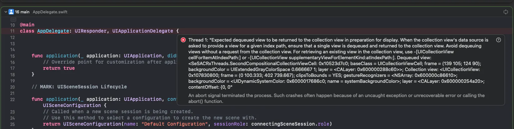 스레드 1: "디스플레이를 준비하기 위해 컬렉션 뷰로 반환될 것으로 예상되는 대기열에서 제거된 뷰. 컬렉션 뷰의 데이터 소스가 주어진 인덱스 경로에 대한 뷰를 제공하도록 요청받는 경우 단일 뷰가 대기열에서 제거되어 컬렉션 뷰로 반환되는지 확인하십시오. 컬렉션 뷰에서 요청하지 않고 뷰를 대기열에서 제거하지 마십시오. 컬렉션 뷰에서 기존 뷰를 검색하려면 -[UICollectionView cellForItemAtIndexPath:] 또는 -[UICollectionView supplementaryViewForElementKind:atIndexPath:]를 사용하십시오.