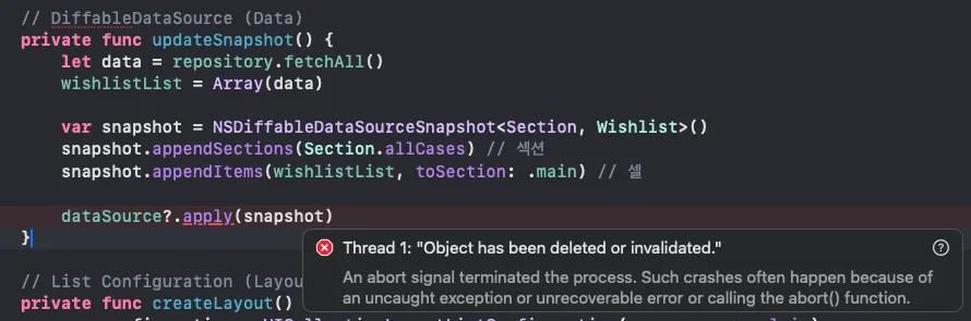 🚨 에러 내용이틀 내내 이거 해결 못하고 있었다.우선 DiffableDataSource와 Realm을 함께 사용했고,Diffable은 데이터가 변하면, 이전 상태와 비교해서 뷰를 갱신하는 방식으로 동작한다.따라서 Realm 데