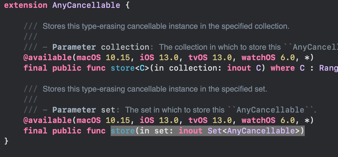 값타입인 Set<AnyCancellable>을 inout 파라미터로 받고있는 것을 볼 수 있다.