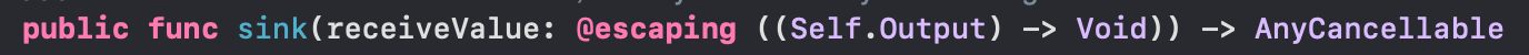 `.sink` 메서드는 Rx의 subscribe에 해당하는 메서드로, AnyCancellable을 반환한다.
