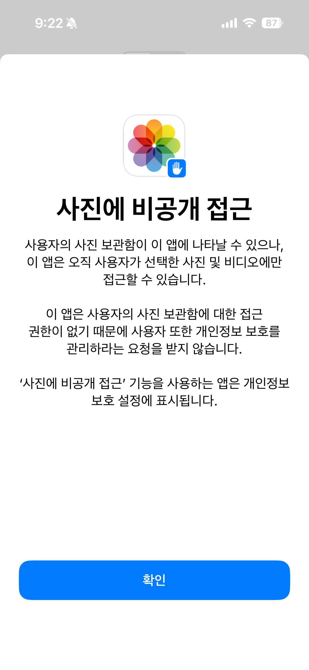 이 앱은 권한 요청을 하지 않은 앱이며, 사용자가 사진을 선택하려 했을 때 "사진에 비공개 접근" 이라는 문구가 떠있는 것을 볼 수 있었다.